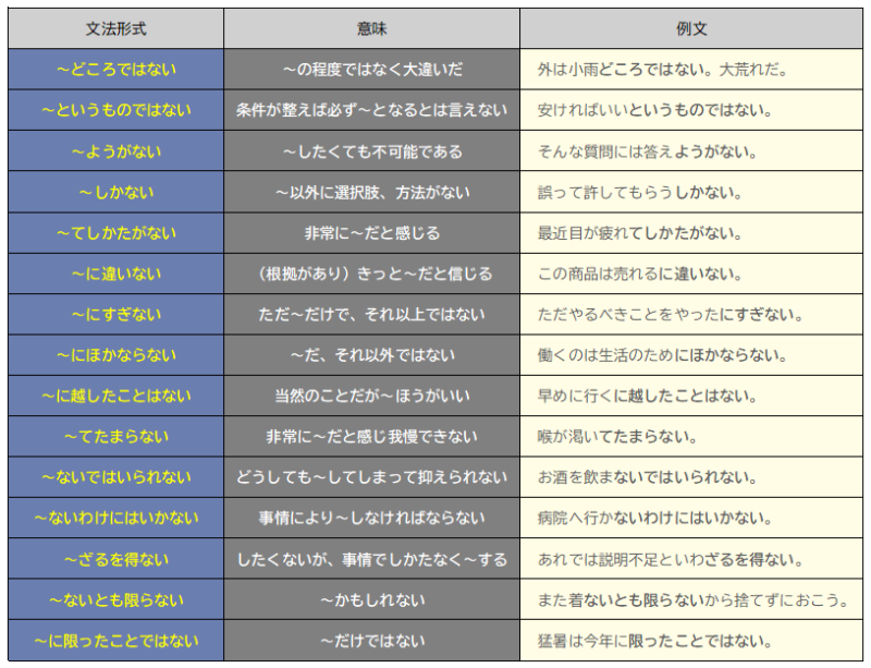 「~ならぬとも限らない」「~ないとも限らない」は二重否定で「~かもしれない」という意味。N1N2レベル(特にN2)で必要とされる文法形式には「~ない」で終わるものが多くあります。その中で重要なものを選んでまとめました。